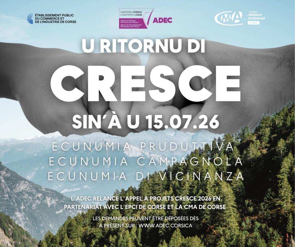 L’Agence de Développement Économique de la Corse (ADEC) relance un nouvel appel à projets CRESCE 2026, dédié au soutien de l’économie de proximité et des territoires ruraux.
